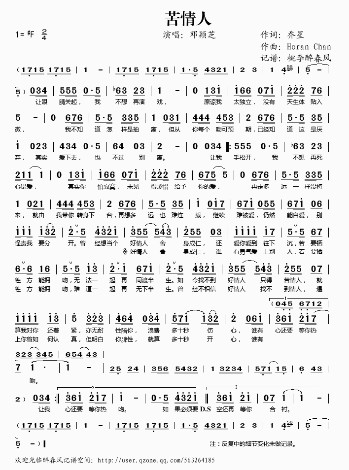 苦情人 简谱 曲谱 歌谱