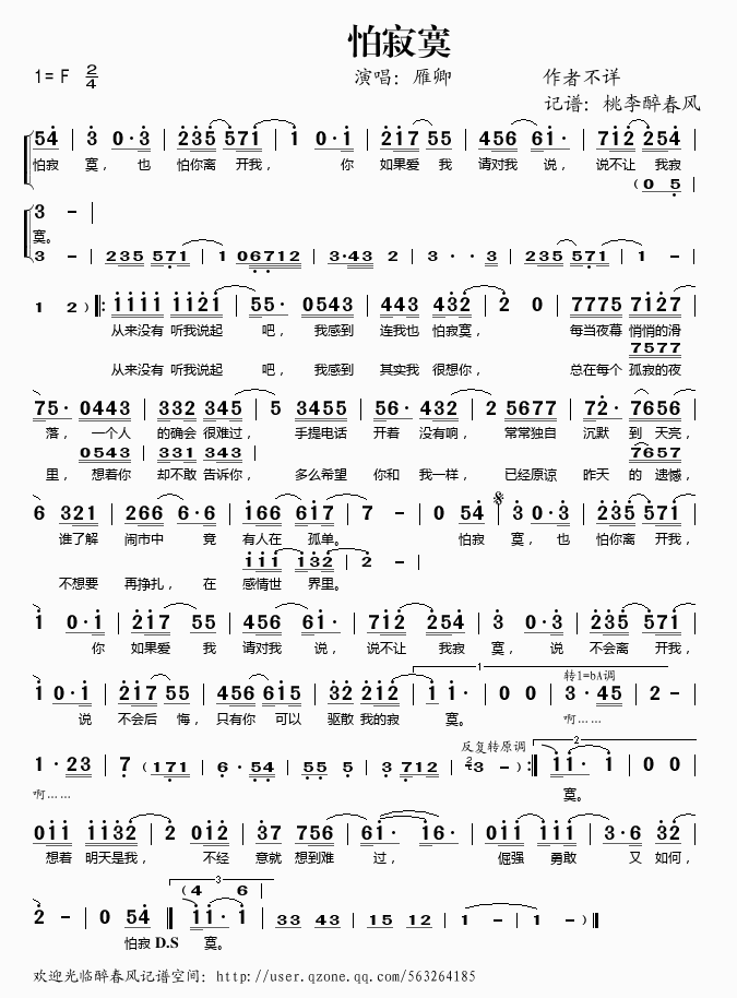 怕寂寞 简谱 曲谱 歌谱