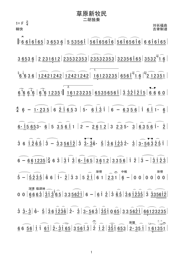 草原新牧民 二胡谱 简谱 曲谱