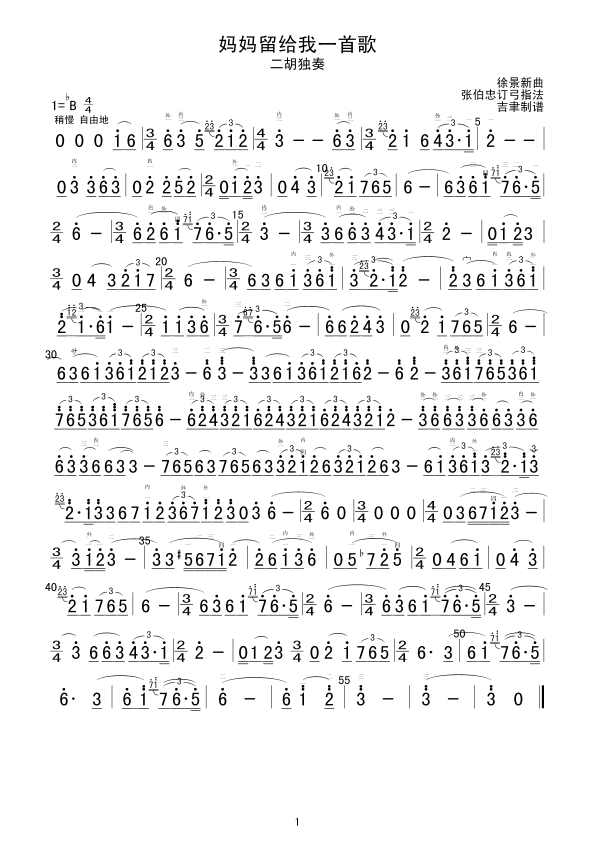 妈妈留给我一首歌 二胡谱 简谱 曲谱