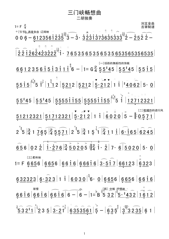 三门峡畅想曲 二胡谱 简谱 曲谱