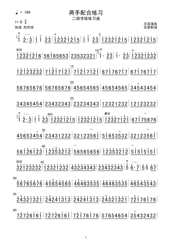 两手配合练习(二) 二胡谱 简谱 曲谱