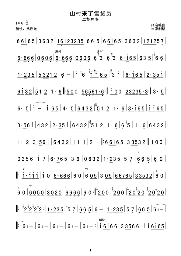 山村来了售货员 二胡谱 曲谱