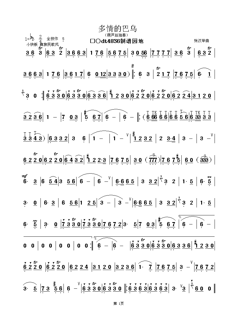 多情的巴乌 葫芦丝 简谱 曲谱
