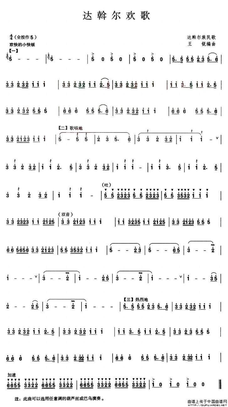 达斡尔欢歌 葫芦丝谱 曲谱