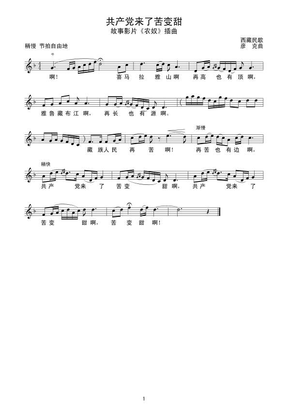 共产党来了苦变甜 五线谱 曲谱 歌谱