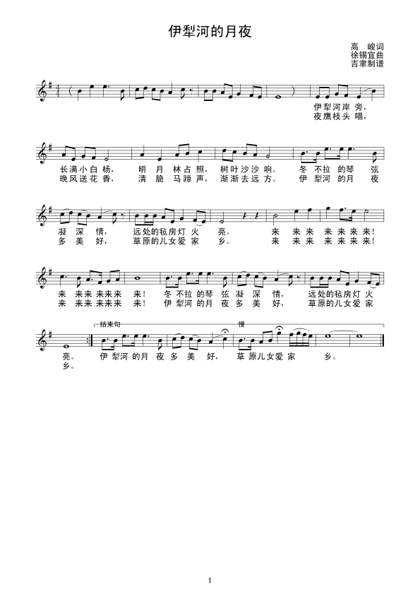 伊犁河的月夜 五线谱 曲谱 歌谱