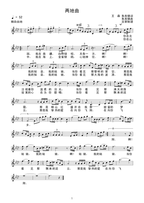 两地曲 五线谱 曲谱 歌谱