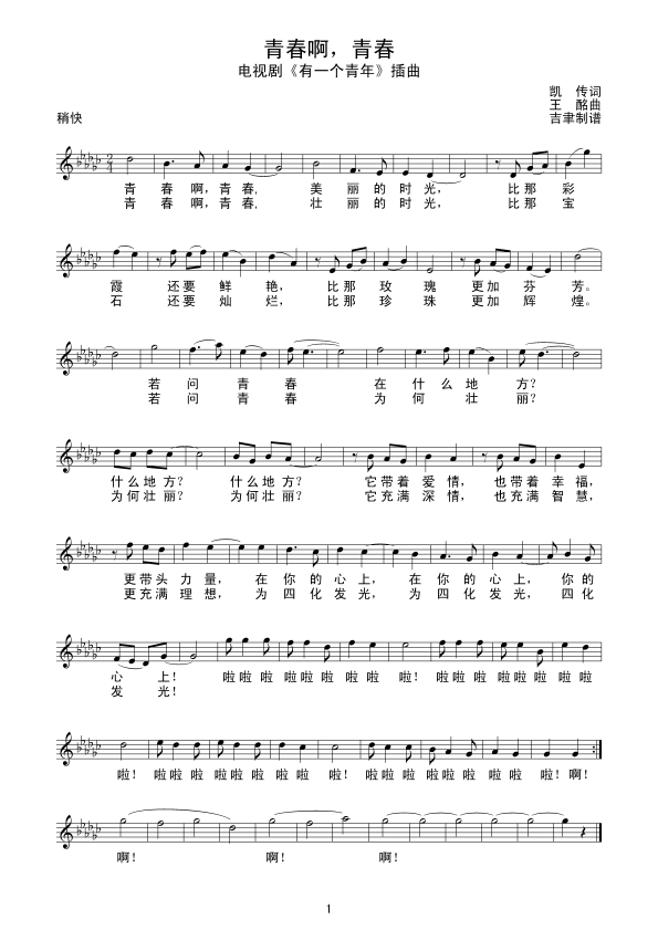 青春啊,青春 五线谱 曲谱 歌谱