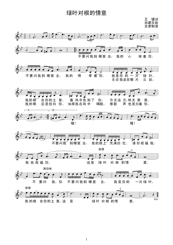 绿叶对根的情意 五线谱 曲谱 歌谱