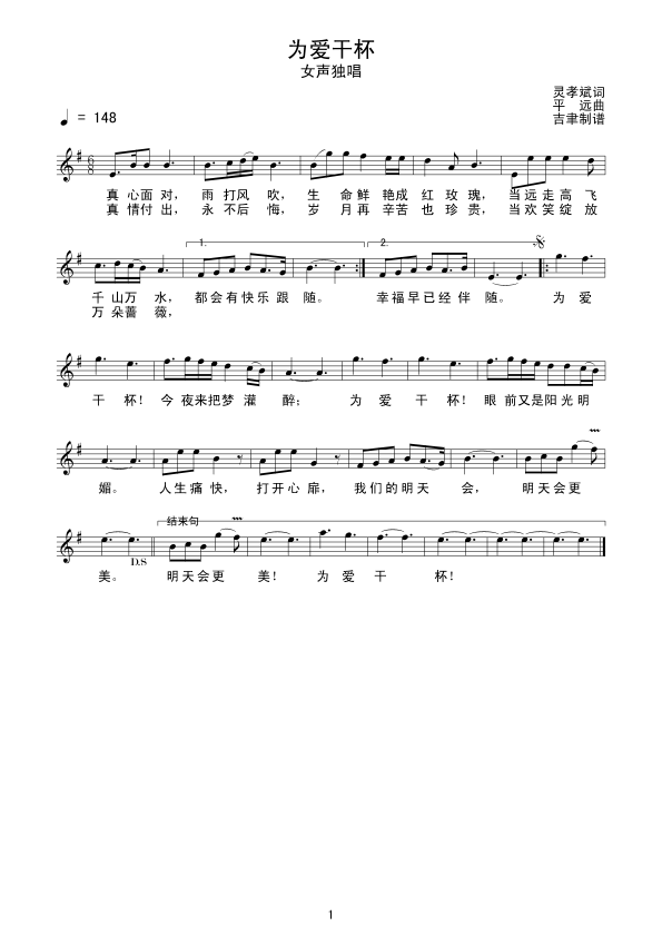 为爱干杯 五线谱 曲谱 歌谱