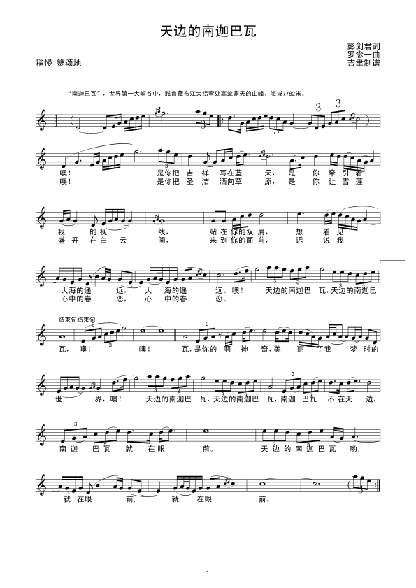 天边的南迦巴瓦 五线谱 曲谱 歌谱