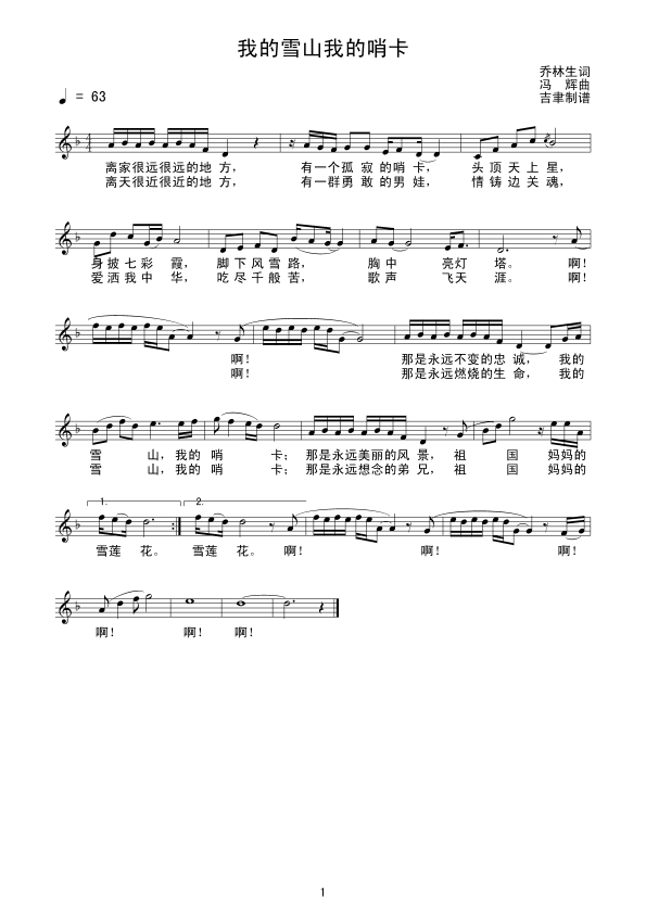 我的雪山我的哨卡 五线谱 曲谱 歌谱