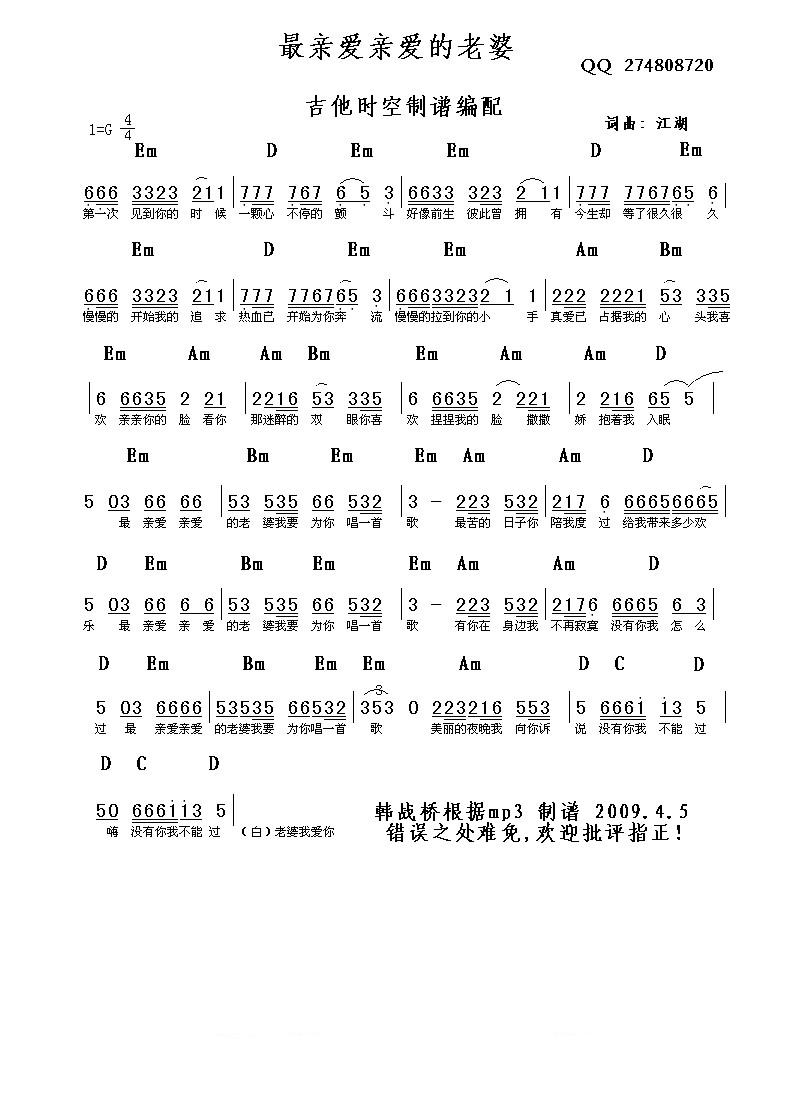 最亲爱亲爱的老婆 吉他谱 曲谱