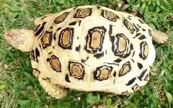 豹龟学名豹纹陆龟,因背甲有黑色斑点和条纹而得名,在生物学分类上属于动物界、脊索动物门、爬行纲、龟鳖目、陆龟科、象龟属爬行动物,原产于非洲南部地区,亚种有东非豹龟、西非豹龟、索马里豹龟等,在我国饲养豹龟必须要有驯养证。