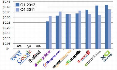 除了几个购物搜索引擎,我们看到大部分购物搜索引擎第四季度的CPC有所下降。其中Pricegrabber每次点击成本是最低的。