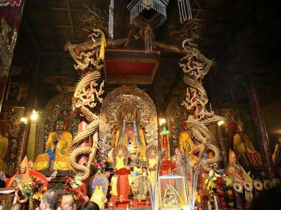 这对龙雕是用,黄泥、纸浆、糯米混合雕刻而成的,而且它最为神奇还是,它龙身之中是没有骨架来支撑的,完全凭借龙爪为支撑点空心的盘旋而上的,在龙身外面也只是刷制了一层金粉,而且经过四百多年的历史、四百多年的沧桑,龙雕至今没有掉色和裂缝的现象发生,这充分的体现了当时工匠的高超雕刻工艺,另外这对龙雕在寺庙中还有一个意义,就是象征民族团结的!!