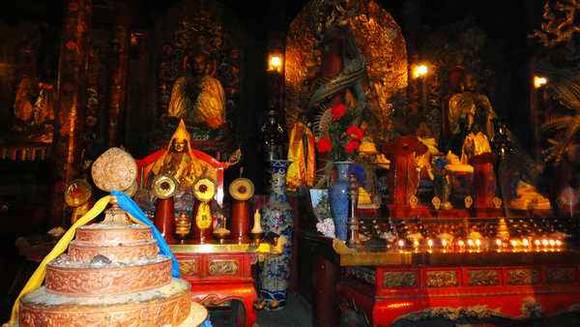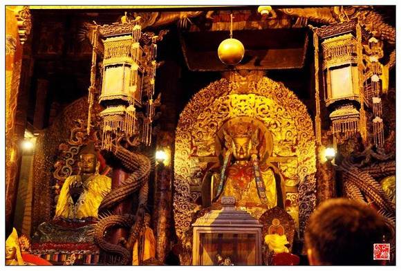 这是一尊用一吨半(三千斤)的纯白银打造的释迦摩尼佛祖像,因为为了防止白银在空气中的氧化流失而发黑,所以在外面镀了一层金箔,以起到一个保护的作用,这尊银佛,庄严肃穆,金碧辉煌,而且是全国至今保存最大、最完整的一尊银制的释迦摩尼佛祖像。这就是大召三绝之首的—银佛。