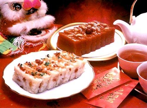 据说最早年糕是为年夜祭神、岁朝供祖先所用,后来才成为春节食品。年糕因为谐音“年高”,再加上有着变化多端的口味,几乎成了家家必备的应景食品。年糕的式样有方块状的黄、白年糕,象征着黄金、白银,寄寓新年发财的意思。