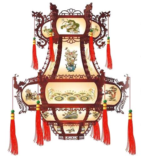 悬挂在厅堂梁上的照明灯具。一般形制较大,周身嵌画绢或玻璃,富有良好的装饰效果。相传,东汉光武帝刘秀建都洛阳、统一天下后,为了庆贺这一功业,在宫廷里张灯结彩、大摆宴席,盏盏宫灯,各呈艳姿。后来,宫灯的制作技术传入民间。"宫灯"之名,由此而生。隋炀帝大业元年正月十五,在洛阳陈设百戏,遍布宫灯,饮宴畅游,全城张灯结彩、半月不息。隋唐之后,每逢元宵节,家家宝灯高挂,处处明灯璀璨、人人提灯漫游,盏盏争奇斗艳。这种风俗,传至全国,波及海外。