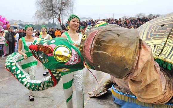 蛇舞则反之,由5位女演员操纵蛇形道具,与龟形道具相配合。