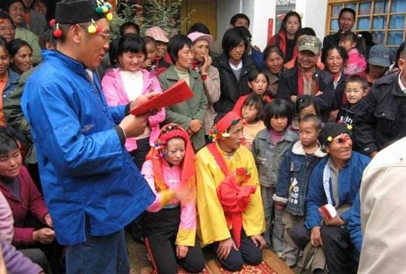下午,男方的媒人领着八至十个老人和两个姑娘挑着礼品送彩礼来了。送进彩礼,摆席吃饭,姑娘们乘新郎不注意时给新郎抹黑脸,逗得大家哄堂而笑。姑娘们笑弯了腰,说:“大家记不得新姐夫,脸黑掉一半的就是!”要转回家时,新郎跪倒在岳父、岳母跟前说:“我要回去了!”二老就说几句吉利话,岳母给姑爷一匹自己织的布,岳父给姑爷五十元钱。这时调皮的姑娘冷不防把一串猪骨头挂在新郎肩上说:“肉我们吃光了,剩下的骨头、皮子请你带回去!”又引起一阵大笑。出了寨子,新郎才把骨头甩掉。