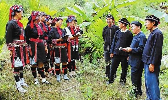 姑娘们一边踏着乐声曼舞,一边注视笙手,选择中意的人,看准了,便走上前去,在小伙子的芦笙上系上一条彩带,并且手牵彩带,伴着芦笙起舞。暮色降临,“游方”坡上,浓荫掩映处,对对情侣或喁喁私语,或对唱山歌,或互赠信物。“游方”不限于特定节日,农闲或其他时节也会举行,不过范围不大,只限本寨男女青年参加。