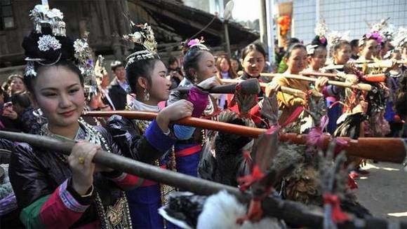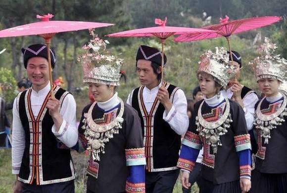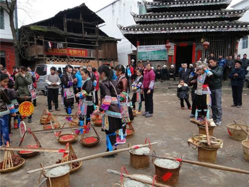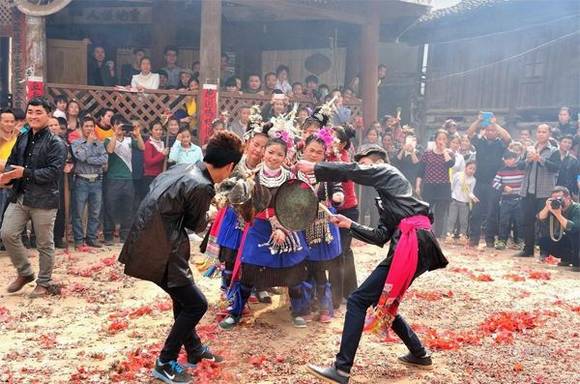 有意思的是,新娘新郎成亲,并不“坐家”(夫妻同居)。次日,新娘吃罢丰盛的“百盘宴”(来参加婚礼的人不带其他贺礼,各带一盘最有侗乡特色的腌鱼、腌鸭、腌肉之类的东西,便由女伴陪同回娘家。以后新郎去女家做客,一旦女方有了身孕,新娘才一边挑着稻草(男耕)一边挑着纺车(女织)来到男家定居。从这时候起,才算是真正的夫妇。