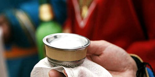 马奶酒性温,有驱寒、舒筋、活血、健胃等功效。被称为元玉浆,是"蒙古八珍"之一。曾为元朝宫廷和蒙古贵族府第的主要饮料。忽必烈还常把它盛在珍贵的金碗里,犒赏有功之臣。当你踏上草原,走进蒙古包后,热情好客的蒙古人便会将美酒斟在银碗或金杯中,托在长长的哈达上,唱起动人的敬酒歌,款待远方的贵客,以表达自己的诚挚之情。这时,客人理应随即接住酒,然后能饮则饮,不能饮品尝少许,便可将酒归还主人。若是推推让让,拉拉扯扯,不喝酒,就会被认为是瞧不起主人,不愿以诚相见等等。主人的满腔热情,常常使客人产生难别之情,眷恋之感。