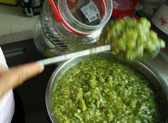 3、发酵3天即闻到满屋酒香,面上起泡,这时加进白糖,十斤猕猴桃加3斤白糖,但不要一次加完,分2——3次加完(发酵期加入白糖不是增加甜度,主要是给酵母菌补充营养、加快发酵,白糖越多生成的酒精浓度越高)。听到坛里咕咕响,起大泡了,每天用竹片或木棒搅拌两次,使其发酵均匀。