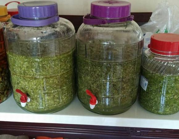 2、把猕猴桃剥去毛皮放在坛子里自然发酵,不剥皮也可以,但要轻轻的冲洗,不能久洗,晾干,把两头削掉,捏破放在坛里)。发酵时不能加酒、不能加水、不放任何发酵药。发酵坛不能装满,最多装2/3满,发酵时要 起泡膨胀,就象熬豆浆一样,泡子要涨满锅。发酵坛口不能封闭严,谨防气压升高胀暴坛子;