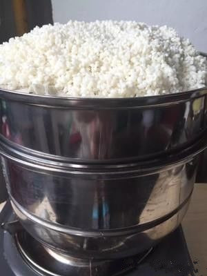 4. 蒸饭:蒸饭目的是使淀粉糊化。目前一般使用卧式或立式连续蒸饭机蒸饭,常压蒸煮25分钟左右即可,蒸煮过程中可喷洒85℃左右的热水并进行抄饭。要求米饭“外硬内软、内无生心、疏松不糊、透而不烂、均匀一致”。