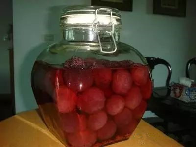 4、最后倒入52度纯粮白酒5公斤,以没过杨梅1-2公分为宜(所选用的白酒最好是自己发酵蒸馏的,确保是纯粮食酒)。盖好盖子用胶带封口。静置半个月以后就可以喝了,取食后及时加盖,可保存数年。