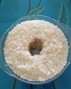 3、晾饭:用勺搅几下或用冷开水将蒸熟的糯米摊开冲洗降温至温热凉至不烫手的温度(30左右利用中温发酵,米饭太热或太凉,都会影响酒曲发酵的),做到米粒之间不粘为好。