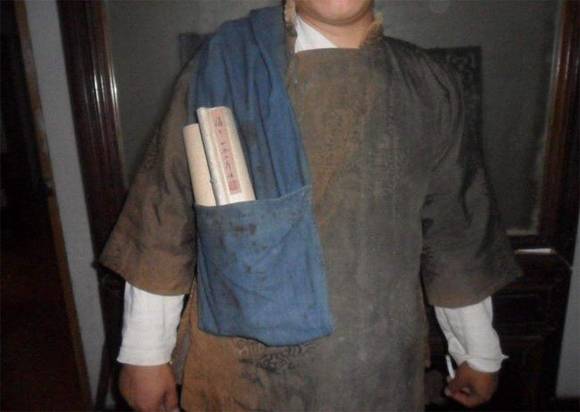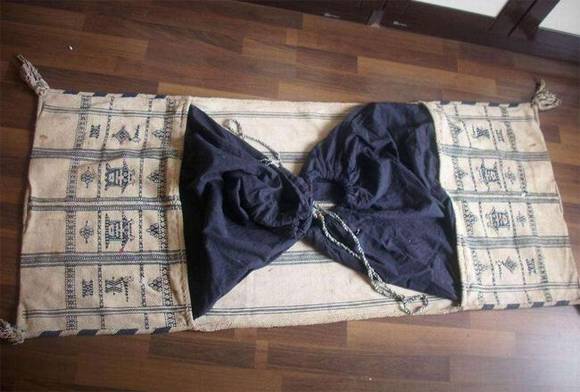 褡裢(dā lian)是昔日我国民间长期使用的一种布口袋,通常用很结实的家机布制成,长方形,中间开口。里面放着纸、笔、墨盒、信封信笺、印章印泥、地契文书、证件帐簿……等等,都是处理文牍的用具。过去的商人或帐房先生外出时,总是将它搭在肩上,空出两手行动方便。后来各式各样的背包、提包发展起来,再也见不到褡裢了。