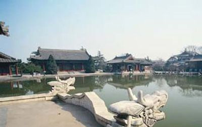 Entering the gate which bears the inscription 'Huaqing Chi' (Huaqing Hot Spring) by Guo Moruo, a noted literary in China, visitors are greeted by two towering cedars. By continuing inward passing two symmetrical palace-style plunge baths and turning right, you will see the Nine-Dragon Lake. Despite the fact that the lake is artificial with an area of 5,300 square meters (6339 square yards), it constitutes one of the main enchanting sceneries in the Huaqing Palace. You will see lotus floating on the water and emitting sweet fragrance, and a white marble statue of Yang Guifei - recognised as one of the four most beautiful women in ancient China - stands tall by the lake like a shy and appealing fairy. Mirrored in the lake you will see a surrounding complex of constructions interspersed with willows and rocks, including Frost Flying Hall (Feishuang Hall) in the north, Yichun Hall and Chenxiang Hall respectively in the east and west as well as Nine Bend Corridor and Dragon Marble Boat. The magnificent Frost Flying Hall used to be the bedroom of Emperor Xuanzong and Yang Guifei, with red supporting pillars and fine-patterned carving. Living in a place so full of spice must have made the inhabitants invigorated and pleased.