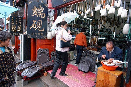 Under the ancient city wall behind the Forest of Steles in Xian, there is a well-known street in the style of ancient towns - Shu Yuan Men. Both sides of the slab stone road are lined with buildings in the Ming and Qing styles. Various crafts and arts are sold on this crowded street all year long. Historical relics, calligraphy, paintings, antiques, jewels, and folk art fine works are all tourist favorites.