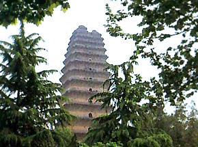 La Petite Pagode de l’Oie Sauvage en Faux étages par encorbellement de briques affiche une silhouette de navette. Elle avait 15 niveaux à l’origine, mais il ne lui en reste que 13 aujoourd’hui avec une hauteur de 43m. Son soubassement carré mesure 12m de chaque c?té. Il y a, à chaque étage, 2 niches vo?tées vers le sud et le nord. Le rez- de –chaussée est pourvu de 2 portes vo?tées vers les 2 mêmes sens. Leurs chambranles et leurs frontons sont couverts de magnifiques gravures des Tang. Principalement, les gravures des déesses vilantes sur les frontons des portes ont une grande valeur artistique.