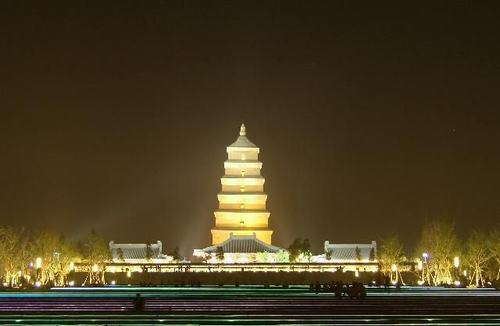 大雁塔は,西安市から南へ4km離れた大慈恩寺の中に聳え立っており,中国の仏教名塔の一つである。大慈恩寺は,隋の開皇9年(西暦589年)に創建された。唐代には合せて13の庭園と1897の部屋があった。雲閣禅庭と高楼宝殿が非常に立派に作られていた。唐王朝は,名高い玄奘法師を大慈恩寺の住職に招いた。大雁塔は,西暦652年に創建された当初は,5階で高さ60mであった。西暦704年に10階に建直された。その後,戦乱で破壊され,西暦930年に7階に再建され,高さ64mとなった。楼閣式の煉瓦造りで, 煉瓦を研磨して隙間を合せる という建築法を採用された。その特徴は,煉瓦で木造の斗組の風格を現すことにある。