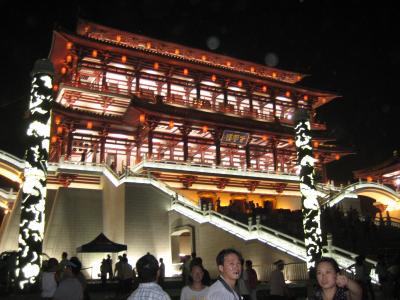 安というと観光地が限られていて普通のツアーならどこの会社で頼んでも大体は同じ観光地なのですが、去年?新しくできた西安の「大唐芙蓉園」に行ってきました。日本でいう長崎のハウステンボスや愛知県の明治村などをイメージしていただくとわかりやすいかと思います。入場料金50元。園内は広大な土地に唐代の建物を復元した豪華な建物がならび圧巻でしたが、とっても暑かったので夕方に回りました。夜は園内の芙蓉湖というところで「水幕映画」を見たのですが、幅が120mぐらいの水の画面にレーザーショーをやったり花火などが上がったりとさすが中国と思うほど迫力がありました。ショーが終わって帰るときに湖に一番近くに座っていたらしい小さな女の子が花火の破片が飛んできたみたいで泣いていたのがかわいそうでした???。