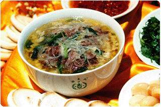 양고기 육수에 납작한 빵을 찢어 넣고 먹는 음식인데, 이 음식을 먹는 방법이 조금 독특하다. 처음 양육포막을 시키면 빈 사발에 동그란 빵이 나온다. 그러면 각자의 취향에 맞게 빵을 사발에 잘라 넣고 다시 직원에게 주면, 직원이 거기에 양고기 육수를 부어준다. 양고기의 누린내를 없애기 위해서 향채(香菜-샹차이)라는 야채를 잘게 썰어 넣는데, 한국 여행객의 입맛에는 그다지 맞지 않으므로, 넣기 전에 맛을 보는 것이 좋다.