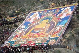 Во время фестиваля на склоне холма выставляется гигантское изображение Будды, проводятся театрализованные представления и ярмарки. Люди пьют водку из ячменя «цинкэ». Чай с топленым маслом, кислое молоко.