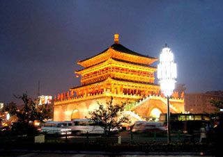 возвышается гигантская Колокольная Башня (Zhonglou). От неё начинаются четыре главных улицы города: Бэй (Bei Dajie, Северная), Нань (Nan Dajie, Южная), Дун (Dong Dajie, Восточная) и Си (Xi Dajie). Первоначальная башня была построена в XIV веке, но перестраивалась в 1739 году. Раньше огромный колокол на башне отмерял своими ударами время. Вход в башню находится на северной стороне через подземный переход. Наверху сейчас выставлена коллекция восковых фигур императоров Чанъани, династии Цинь, Хань и Тан. |