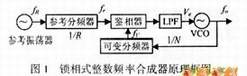 锁相式频率合成器是采用锁相环()进行频率合成的一种频率合成器。它是目前频率合成器的主流,可分为整数频率合成器和分数频率合成器[2]。在压控振 荡器与鉴相器之间的锁相环反馈回路上增加整数器,就形成了一个整数频率合成器。通过改变分频系数N,压控就可以产生不同频率的输出信号,其频率 是参考信号频率的 整数倍,因此称为整数频率合成器。输出信号之间的最小频率间隔等于参考信号的频率,而这一点也正是整数频率合成器的局限所在。图1是锁相式整数频率合成器的原理框图。
