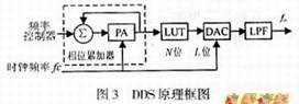 如图3所示,由相位累加器(PA)、正弦查询表(LUT)、D/A转换器()和低通(LP F)等部分组成。DDS的工作原理实质上是以数控的方式产生频率、相位可控制的正弦波。相位累加器由N位全加器和N位累加寄存器级联而成,对代表频率的码 进行累加运算。幅度/相位转换电路实质上是一个波形寄存器,以供查表使用,读出的数据 送入D/A转换器和低通。工作过程为:每来一个时钟脉冲fclk,N位加法器将频率控制数据与累加寄存器输出的累加相位数据相加,把相加后的结果送至累加寄存器的输入端,以使加法器在下一时钟的作用下继续与频率控制数据相加;另一方面输出M位作为取样地址值送入幅度/相位转换电路,幅度/相位转换电路根据这个地址输出相应的波形数据。最后经D/A转换器和低通器将波形数据转换成所需要的模拟波形。相位累加器在基准时钟的作用下,进行线性相位累加,当相位累加器加满时就会产生一次溢出,这样就完成了一个,该周期就是DDS信号的频率周期。其主要关系式为: