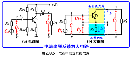 图中Re是反馈元件,它构成反馈网络,由图(b)可以看出,反馈网络与基本放大电路在输出端串联,故为电流反馈,反馈网络与基本放大电路在输入端串联,故为串联反馈,假定UI的瞬时极性为+,则Uf的极性为-,结果使放大电路有效输入信号减弱,故为负反馈。