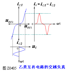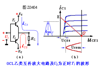 二、OCL互补对称电路图Z0404所示电路的缺点是当输入信号ui的瞬时值小于T1,T2 的死区时,三极管不导通,只有当ui 的瞬时值过越Uγ以后,管子才导通。因此两管轮流工作衔接不好,出现了一段死区,产生了所谓的"交越",如图Z0405示。