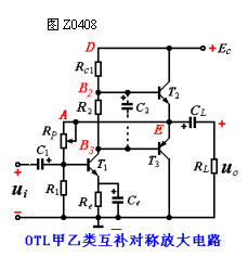 图Z0408采用一个供电的互补对称,它去掉了负,在输出端接入一个容量较大的器CL,输出信号通过CL耦合到RL,而不用,故称无输出变压器电路,简称OTL电路。 [ OTL是Output Transformarle less(无输出变压器)的缩写。]