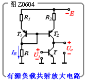 图Z0604是有源负载共射放大电路的基本形式。图中T是共射放大级,型管T1 、T2及组成恒流源电路。此时,放大电路的负载为有源器件T2,故称为有源负载放大电路。