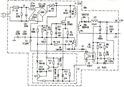 电流的稳压环节由U1、U2、U3及其外围元件构成。反馈绕组NF感应出的交流电压经D7整流、C3滤波之后作为光耦器的工作电压,又是稳压环节的取样电压。当+12V输出电压升高时,经R8、R9分压后得到取样电压,与U3(TL431)中的2.5V带隙基准电压进行比较,使K点电位降低,U2中的的工作电流